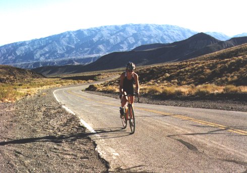 The rest of the ride to the top of Townes Pass was in daylight, so the support vehicle stops were a little further apart than they had been in the dark of night. Deborah made it to the top in short order and then flew down the nine mile hill at speeds sometimes over 48 mph. The five miles Deborah rode between the bottom of the hill and the restaurant in Panamint Springs where I waited were particularly grueling. When she arrived at the restaurant, she did not feel well.